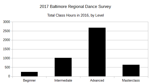 Within this sample, mostly “Advanced” training. But this chart has some issues that break credibility. While it’s easy to understand less than 20 hours a year of Masterclass-level training (that’s a week in New York, so that could take a good chunk of a dancer’s annual training budget), it’s more difficult to understand only 134 hours/year of Advanced classes. Advanced classes are, by definition “taught on a regular basis by local instructors” – but that works out to just 2.5 hours per week. In fact, ALL of the reported training in this question adds up to just 4.9 hours per week per respondent. it is interesting that half of all training by these respondents is at the Advanced level, but is this 5-hours-per-week number reasonable? Perhaps some of this is related to the age bias in the survey (are older dancers training less?), and perhaps some of this has to do with challenges of the definitions. When I say “class” and “taught” does that mean something new? Does it exclude regular training or performance rehearsal time? Or am I thinking too hard past the actual data? Is 5 hours of training per week reasonable for this set of dancers? If not, how can I fix this?